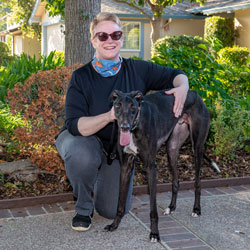 Holly is home in Lincoln with Freddy, now Winston, who just flew in from Australia. Holly came to our San Ramon meet and greet and fell in love with the Greyhounds. Now she has her own.
