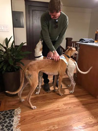 Ashley wanted a cuddly dog for her senior Dobe who just lost his BFF. What a great match, a senior greyhound. Tyler, now Ty, is living with Ashley and family